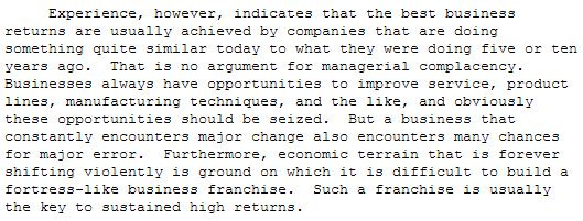 Buffett then voices his opinion on the importance of predictability and stability in business models: