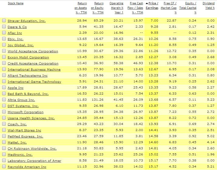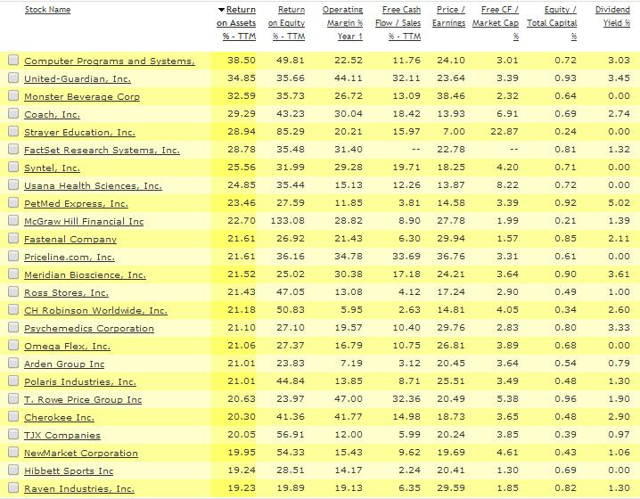 Here is a look at the same list of 143 stocks that have produced 15% ROE in each of the past 10 years, this time sorted by highest Returns on Assets: