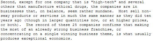 So Buffett's top 7 non-financial businesses produced fabulously high returns on equity with very little use of debt. In short, they were outstanding businesses. Buffett proudly goes on to say that "You'll seldom see such a percentage anywhere, let alone at large, diversified companies with nominal leverage." Of course, investor returns depend on price paid in relation to value received, and we are only discussing the value received part of the equation here.