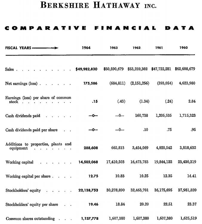 "Our policy of closing plants which could not be operated profitabily was continued, and, as a result, the Berkshire King Philip Plants A and E in Fall River, Mass. were permanently closed during the year. The land and buildings of Plant A have been sold and those of Pant E offered for sale.... Berkshire Hathaway has maintained its strong financial positiona nd it would seem constructive to authorize the Directors, at their discretion, to purchase additional shares for retirement."