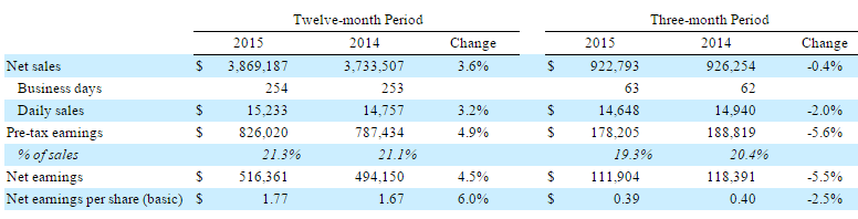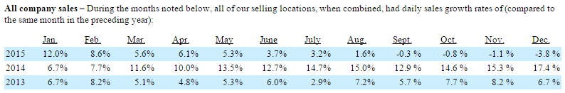 The business currently is struggling. This is likely obvious at this point, but the energy sector has a long reach and problems are arising at other manufacturing firms and service providers that do business with energy companies. Fastenal is an example of a company impacted indirectly by the commodity rout, as many of its customers do business in the oil and gas industry. Here is the snapshot of their year: