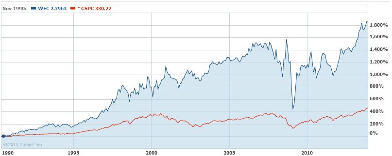 However, after I dig into the 10-K and the FDIC call reports, I find myself asking something like this… Why would I want to buy this tiny bank that produces returns on tangible equity of around 8%, and trades at 7 times pretax earnings when I could buy WFC that produces 18% ROTE, also trades at 7 times pretax earnings? Of course, the initial attraction is the fact that the tiny bank trades at .8 times tangible book, and WFC trades at 2.0 times tangible book… but in the end, my guess is more wealth will be created by the company that produces 18% returns than the company that only produces 8% returns, and although the better company’s assets are more expensive, you can buy both of them at the same price relative to earnings! And, the better company has a much margin of safety via their scale (see the map above), which helps protect it during tough times… So you get a better offense (earning power) and a stronger defense (low cost and scale) and you don't even have to pay a premium for it! They both are priced at 7 times pretax earnings (this is just an example, but one that I've come across many times with these same basic numbers). Of course, another picture that shows the power of Wells Fargo is pulling up a long term chart. This chart goes back to 1990, when WFC traded around $2, and has since averaged 13.7% annually vs. 6.8% annually for the S&P (neither numbers factor in dividends):